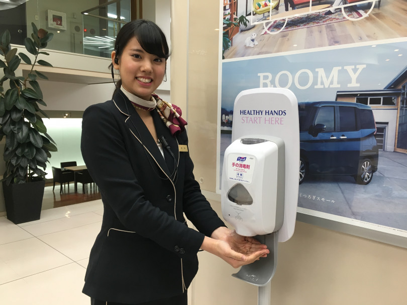 石川トヨタでは消毒用オートディスペンサーを設置しています。