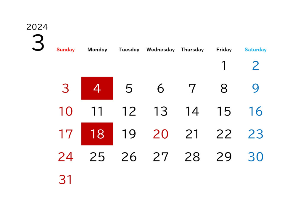 11日(月)・25日(月)は、通常営業しております。3月は他の月より営業日が多くなっております!